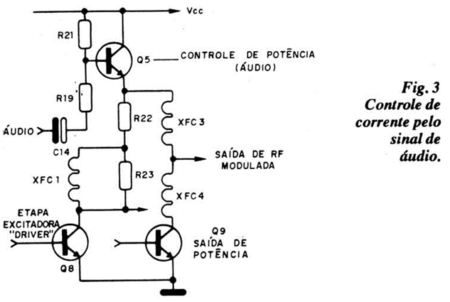 Na figura 3 mostramos de que modo o sinal de áudio controla a corrente, tanto na etapa final corno na excitadora de RF do transmissor.