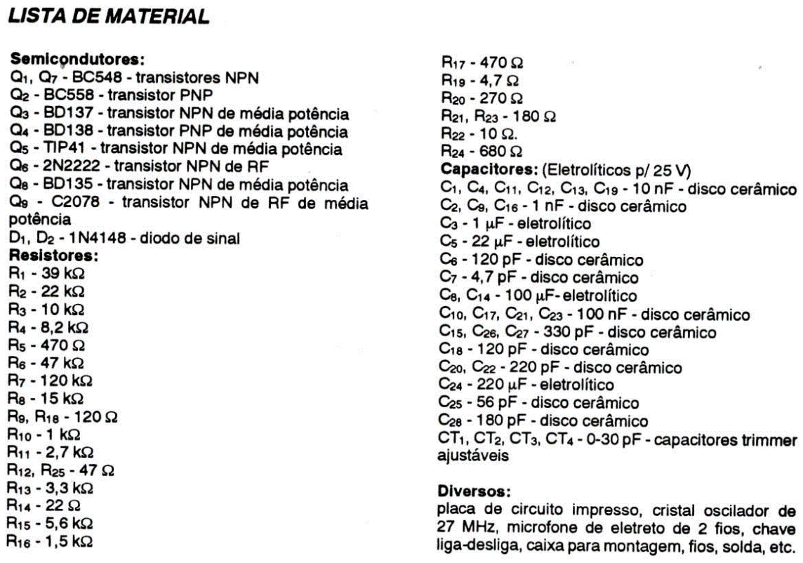Observe que as etapas de amplificação de RF são todas sintonizadas o que exige do montador uma certa habilidade nos ajustes, para colocar o circuito em condições de fornecer a máxima potência de saída.