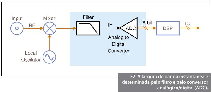 Nessa figura, o analisador de sinais vetoriais converte uma porção do espectro de RF para uma FI que seja reconhecida pelo ADC. A largura de banda instantânea de um instrumento de RF é determinada por dois componentes principais: