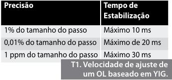 Em sistemas típicos, quando se sintoniza de uma frequência para outra, o OL geralmente ultrapassa levemente a frequência desejada e, em seguida, estabiliza-se na frequência desejada em certo período de tempo. Na maioria dos casos, a velocidade de ajuste é função do tamanho do passo de frequência. Quanto maior o passo de frequência, maior é o tempo necessário para o OL sintonizar com uma faixa especificada. A tabela 1 ilustra o tempo de estabilização para um OL baseado em YIG.