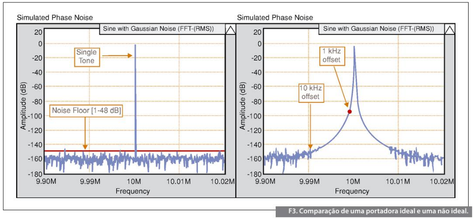 Um modo fácil para visualizar os efeitos do ruído de fase é analisar um único tom no domínio da frequência. A figura 3 representa duas portadoras simuladas — uma portadora ideal e outra portadora com ruído de fase.