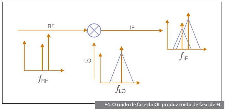 A significância do ruído de fase de um instrumento de RF varia de uma aplicação para outra. Um pequeno ruído de fase é requerido na detecção de sinais bloqueadores debaixo nível que estejam perto de um sinal de interesse em particular. Quando se utiliza um OL com ruído de fase significativo, o ruído de fase é amplificado no sinal de FI resultante. A figura 4 mostra o ruído de fase do OL traduzido para o ruído de fase do sinal de FI resultante.
