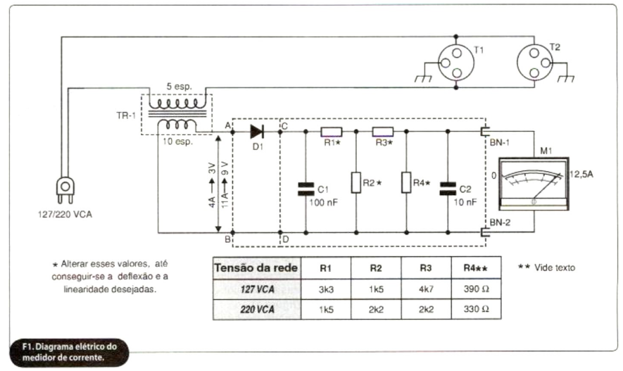 A tensão induzida, medida entre os pontos A e B, figura 1, deve aumentar linearmente com o aumento da corrente que circula pelo primário. A função do diodo D1 é de converter a corrente alternada, induzida no secundário, em contínua, empregada para deflexionar o ponteiro do medidor M1, com a escala graduada de 0-12,5 A.
