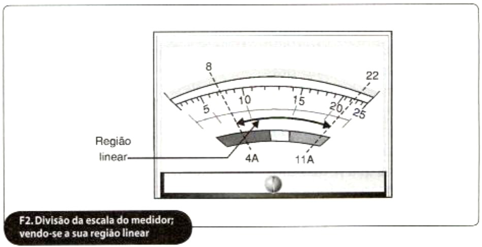 Os fornos de micro-ondas, quando alimentados em 127 VCA, consomem em torno de 11 A. Como a escala do medidor empregado vai de 0-25 mA, para medir-se os 11 A, devemos dividir o valor da escala por dois. Com isso, cada divisão passa a valer 0,5 A. Desse modo, podemos medir no máximo 12,5 A.