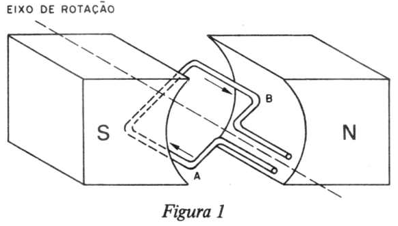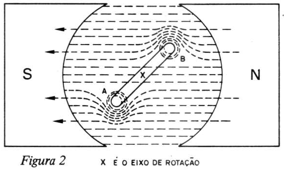 Suponhamos que uma espira de fio esteja no campo magnético de um ímã cujos polos são côncavos, de modo que o campo magnético durante a rotação da bobina seja sempre radial e uniforme, a fim de que a força de torção aumente uniformemente com o aumento de corrente. Estabeleçamos uma corrente que de início seja contínua e constante com o tempo. O resultado está na fig. 2 onde a vista em corte mostra as linhas de força magnética