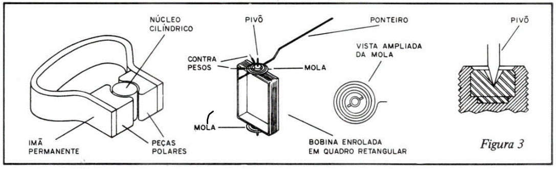 A corrente entra e sai na bobina pelos fios de suspensão. O momento que deflete o sistema indicador é produzido pela reação da corrente na bobina com o campo magnético no qual está suspenso.