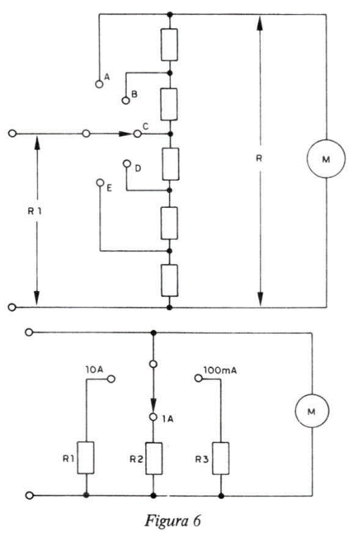 Tais shunts, constam de um dispositivo potenciométrico, onde o fator multiplicativo da escala de corrente é função da relação R/R1 igual a 1, 10, 100, 300 e 1 000, nas várias posições da chave, a escala de corrente será multiplicada exatamente pelo fator correspondente à posição da chave. O único requisito existente é o de que a resistência total (R) seja tal que, com a chave seletora na posição A, o medidor leia deflexão total. Isso pode ser possível com o auxílio de uma resistência adicional variável que é posta em paralelo com todo o divisor.