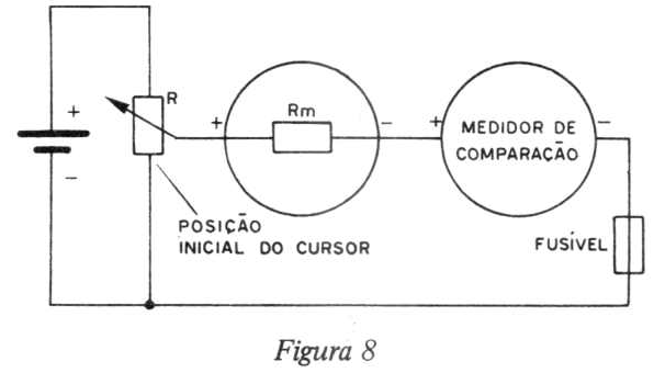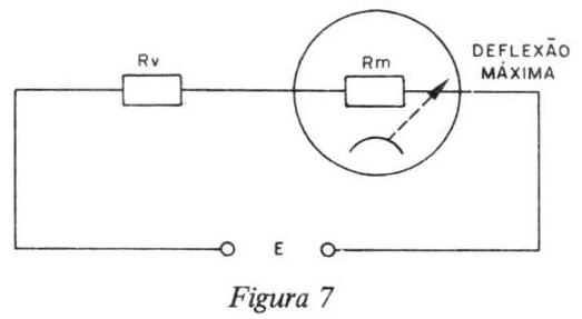 Para termos a deflexão máxima da corrente no nosso medidor de escala desconhecida, acoplamos outro medidor de boa precisão em série. Variamos o potenciômetro até máxima deflexão do ponteiro. Temos o correspondente valor no medidor de comparação e achamos o máximo valor da deflexão. Isso ocorre porque muitas vezes nos chegam às mãos medidas sem nenhuma escala.