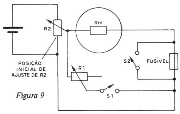 1. Ajusta-se R2 até a máxima deflexão no medidor, com R1 fora do circuito.