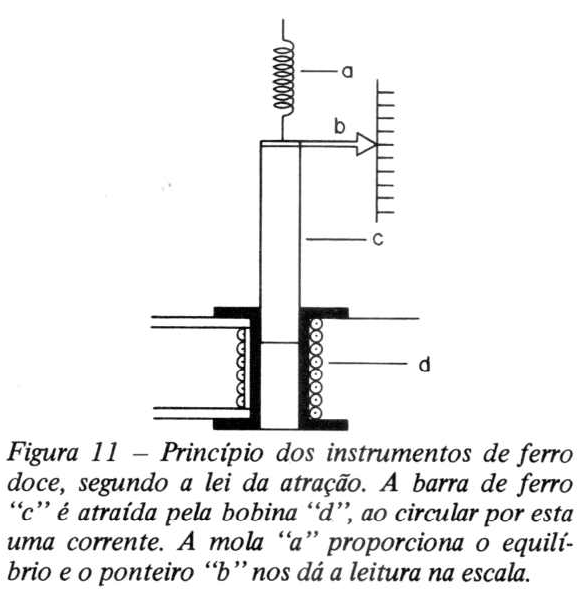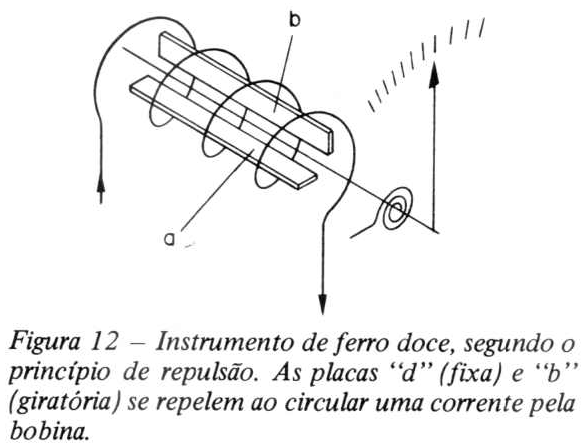 Suspende-se uma barra de ferro doce através de uma mola, ficando a outra extremidade da barra sobre uma bobina percorrida por uma corrente. O campo magnético da bobina magnetizará o ferro doce, ou em outras palavras, o campo magnético influenciará os ímãs elementares da barra de tal modo que todos os polos sul destes pequenos ímãs se voltam para o polo norte do campo magnético da bobina. O mesmo fenômeno acontecerá se a barra de ferro doce se aproximar do polo sul do campo magnético da bobina, isto é, quando o sentido da corrente na bobina se inverter. Se a intensidade da corrente aumentar, a intensidade do campo magnético dentro e à volta da bobina aumentará do mesmo modo, e a força de atração da barra de ferro doce tornar-se-á maior também. Nestas circunstâncias, a barra de ferro doce será atraída para o interior da bobina. É este o princípio no qual se baseia um tipo de aparelho de medida de ferro móvel, o tipo de "ímã atraído". Contudo, este tipo de aparelho de medida de ferro móvel, mais geralmente usado, é baseado no princípio de repulsão, representado na figura 12; é constituído por uma bobina com duas pequenas peças de ferro doce, uma das quais é fixa (a) e a outra (b) gira livremente em torno de um eixo. A esta segunda peça está presa uma agulha ou ponteiro.