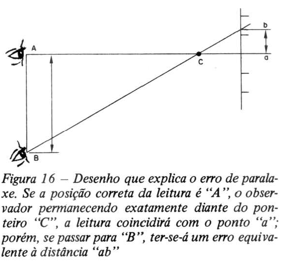 Observando a figura 16, podemos ver facilmente como este erro pode ocorrer. A posição correta do olho é em A, precisamente na direção do ponteiro C e a leitura corresponde ao ponto "a".