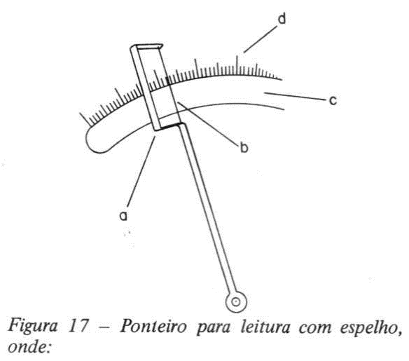 Para evitar este erro de paralaxe usa-se muitas vezes um ponteiro com a extremidade pontiaguda. Não haverá erro de paralaxe desde que se olhe o ponteiro bem de frente, de forma a vê-lo como uma linha. Algumas vezes a escala esta combinada com um espelho; neste caso a leitura estará correta quando virmos o ponteiro na mesma direção que sua imagem no espelho. Outras vezes ainda, e em combinação com a escala e espelho, utiliza-se um ponteiro com cabelo (figura 17). Este é simplesmente um fio fino "b", esticado na extremidade do ponteiro. As outras letras na figura 17 indicam o espelho "c" e por cima dele, a escala "d".