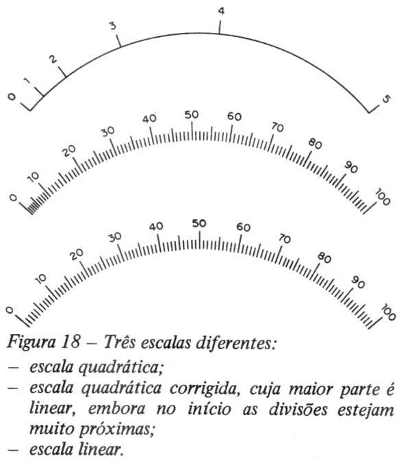 Quando a intensidade da corrente duplica, a intensidade do campo magnético da bobina também duplica e, portanto, o magnetismo de duas das peças de ferro no seu interior torna-se duas vezes maior. Uma vez que a força de repulsão entre duas peças de ferro depende do magnetismo entre ambas as peças, a força de repulsão aumenta 2 x 2 = 4. Por isso a escala de um aparelho de ferro móvel terá a forma indicada na figura 18-a. Esta escala é pouco prática, porque aproximadamente 1/5 dela (no começo) está de tal modo apertado, que não se pode utilizá-la.