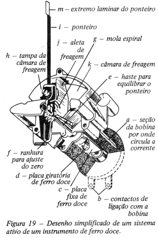 A figura 19 mostra um desenho simplificado da construção de um aparelho completo de medida de ferro móvel. Neste desenho, "a" é a bobina através da qual passa a corrente; "c" e "d" são as peças de desvio na bobina, entre as quais a força de repulsão varia quando variar a intensidade de corrente; "g" é uma mola em espiral, para o binário resistente.