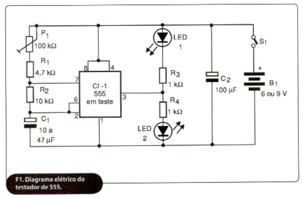 No entanto, como no caso da maioria dos circuitos integrados comuns, só existe um meio de provar se um 555 está bom: elaborando um circuito típico em que ele funcione. É o que propomos aqui: um circuito que o leitor pode deixar pronto, exceto pelo 555, que será encaixado no suporte apropriado para o teste.