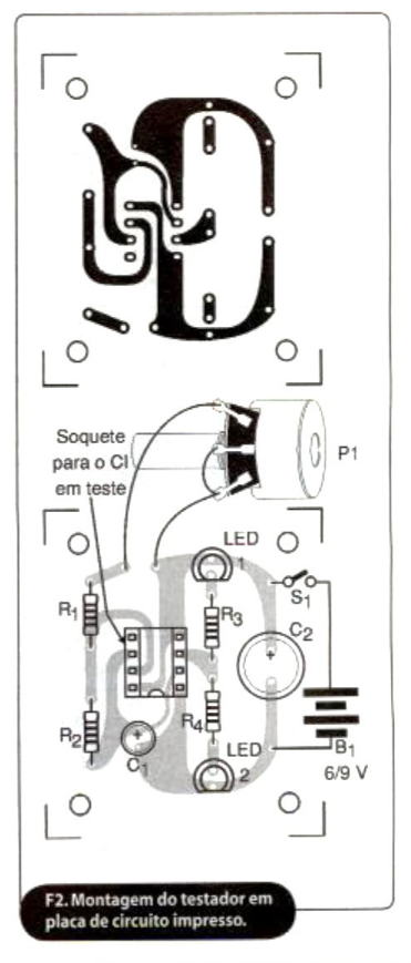 Na figura 2 observamos a disposição dos componentes numa placa de circuito impresso. Para encaixar o circuito integrado usamos um soquete DIL de 8 pinos, procurando ter o cuidado de marcar a posição do pino 1, pois se ele for encaixado errado, o circuito de teste irá indicar que ele se encontra ruim, mesmo que não esteja.