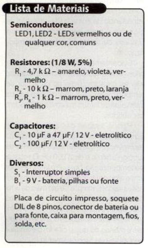 Esta frequência, da ordem de fração de hertz até alguns hertz, faz com que dois LEDs ligados na saída do 555 pisquem alternadamente quando ele oscilar.