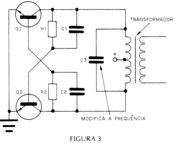 O oscilador opera numa frequência que varia entre 100Hz e 1 000 Hz dependendo dos valores dos componentes usados, basicamente do capacitor ligado em paralelo com o primário do transformador, conforme mostra a figura 3. Conforme o tipo de transformador usado pode-se alterar o valor deste componente para se obter a melhor frequência e, portanto, melhor desempenho do circuito.