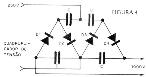 Na etapa seguinte, representada pelo segundo bloco, temos um quadruplicador de tensão formado por 4 diodos e 4 capacitores. Este circuito, mostrado em pormenores na figura 4, tem por finalidade aumentar a corrente alternada do secundário do transformador que aparece sob tensão da ordem de 120 à .250V para um valor contínuo de 500 à 1000V, mas com corrente menor ainda que os 0,4 mA.