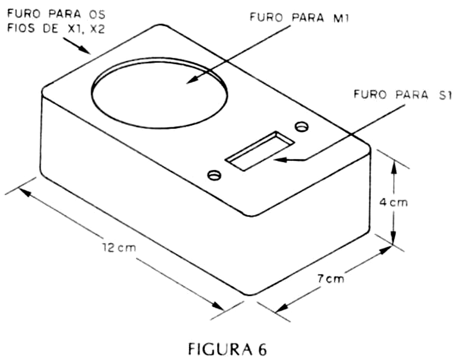 Começamos pela caixa que preferivelmente deve ser de plástico em vista de seu isolamento, já que o circuito é bastante sensível a fugas de correntes. As dimensões da caixa são as sugeridas na figura 6, observando-se que na parte frontal temos apenas um controle que é o interruptor liga/desliga. O trimpot de ajuste de deflexão do instrumento poderá ficar instalado internamente com acesso por um furo na caixa. O ajuste será então feito com a ajuda de uma chave de fendas.