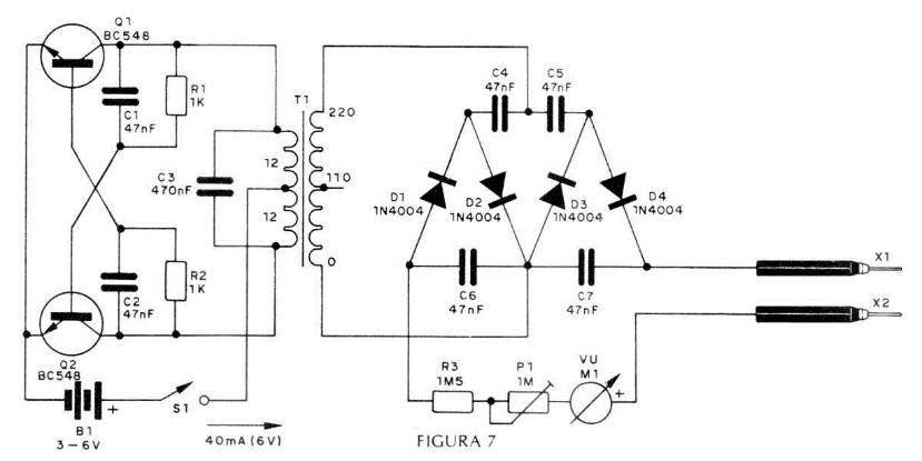 O transformador é de alimentação com primário de 110V e 220V e secundário de 9+9 ou 12 +12V x 350mA ou 500mA. Na verdade, a tensão de secundário não é muito importante neste caso, nem sua corrente, pois para cada tipo pode-se obter bom funcionamento bastando alterar o valor de C3 e dos resistores R1 e R2. Observe que o transformador opera invertido no caso, o enrolamento primário de 220V funciona como secundário no megohmetro.