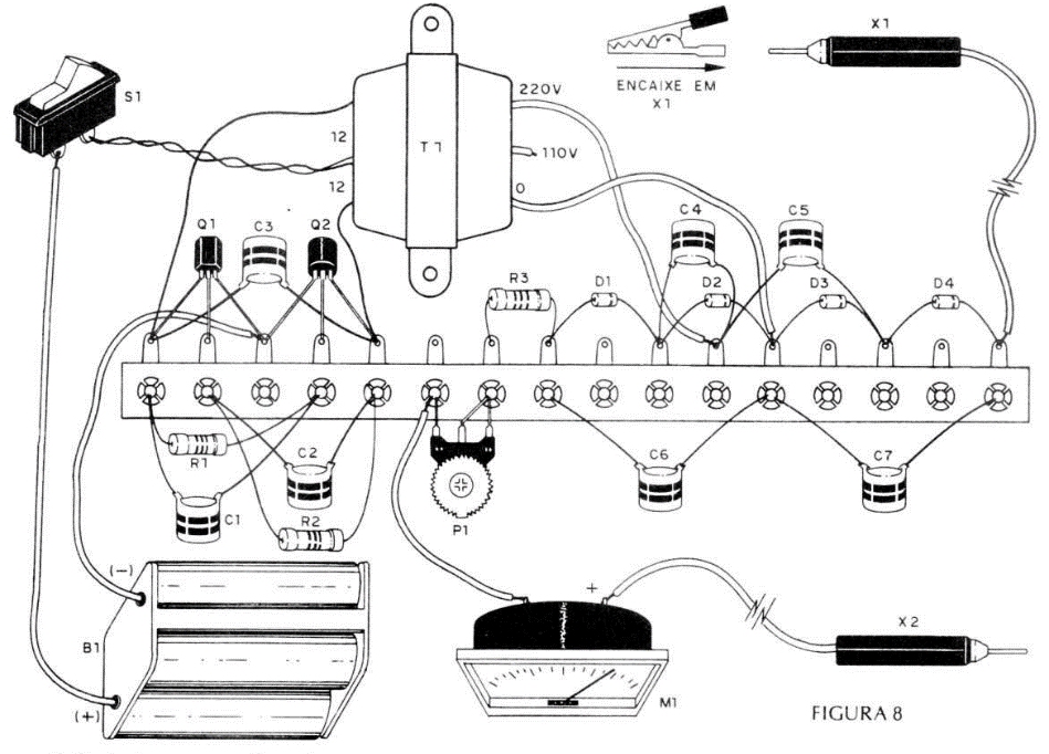f) Complete o trabalho na ponte ou placa com as interligações entre os componentes e com a soldagem de fios que vão aos componentes externos, ou seja, o suporte das pilhas, o instrumento, o interruptor geral e as pontas de prova X1 e X2. A ligação do transformador também deve ser feita nesta etapa. Raspe bem os fios esmaltados do transformador antes de fazer a soldagem. Use uma lâmina de barbear para esta finalidade.
