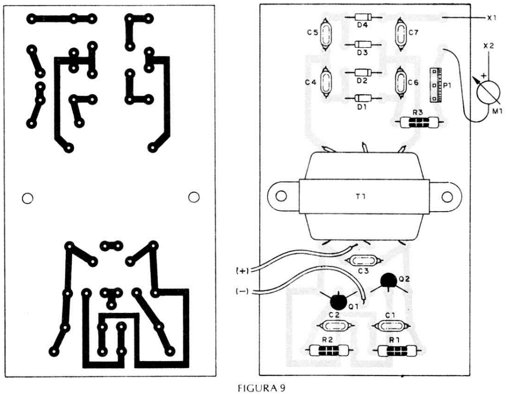 Na figura 7 temos o circuito completo do Megohmetro com os valores dos componentes. Para a versão em ponte de terminais o leitor deve seguir a figura 8, e para a versão em placa de circuito impresso temos o seu desenho na figura 9. Em qualquer das duas montagens, sugerimos ao leitor que sempre procure acompanhar o circuito da figura 7 para se acostumar com a simbologia empregada em eletrônica