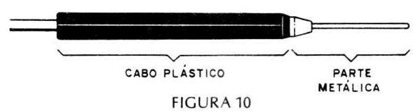 Comece a montagem com a preparação da caixa, fixação do transformador, do instrumento M1 e do suporte das pilhas. Prepare as pontas de prova que são do tipo que pode ser adquirido pronto. Não se recomenda neste caso a improvisação de pontas em vista das tensões altas que aparecem nas mesmas e que não são facilmente isoladas por qualquer material e que, portanto, podem influir no funcionamento do provador (figura 10).