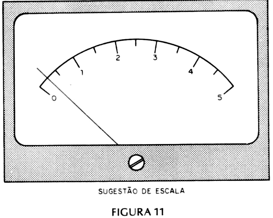 Com a agulha marcando o máximo na escala o aparelho está pronto para ser usado. Na figura 11 damos uma sugestão de escala que pode servir de base para o leitor. O 5 da escala, num instrumento de 4 pilhas significa resistência nula. A marcação 4 indica uma resistência de 500k aproximadamente, e o 3 indica uma resistência da ordem de 2M. O "1" indica uma resistência da ordem de 10M.