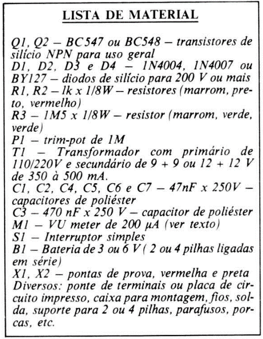 P1 é um trimpot comum cujo valor pode situar-se entre 1 M5 e 2M2, e o instrumento é um VU-meter comum do tipo usado em aparelhos de som com escala de 200 µA.