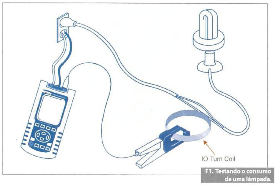 Assim sendo, como primeiro procedimento, o engenheiro fez uma configuração especial de teste para poder acoplar o instrumento usado na avaliação. Esse sistema de teste consiste em se medir a tensão e também capturar por uma bobina a corrente circulante na lâmpada avaliada, no caso do tipo compacto, conforme mostra, o circuito da figura 1.