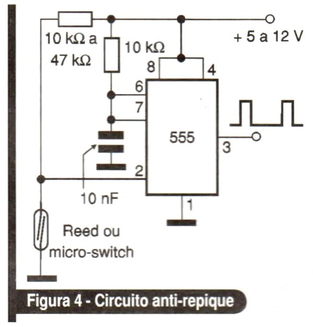 Um exemplo de circuito anti-repique simples usando um monoestável 555 é mostrado na figura 4.
