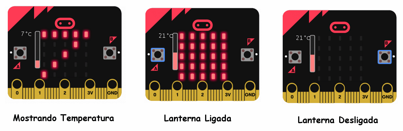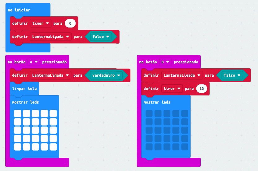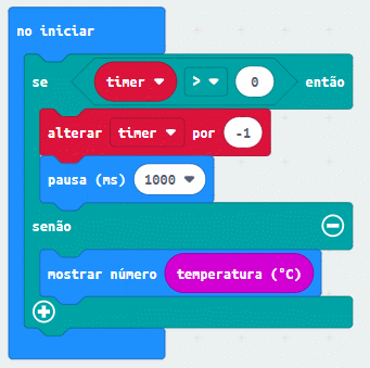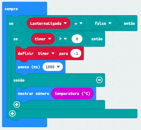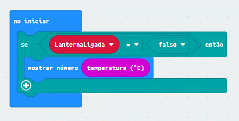Ou seja: quando a lanterna está acesa, não é necessário mostrar a temperatura. Os blocos para fazer isso seriam assim: