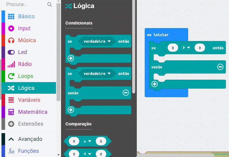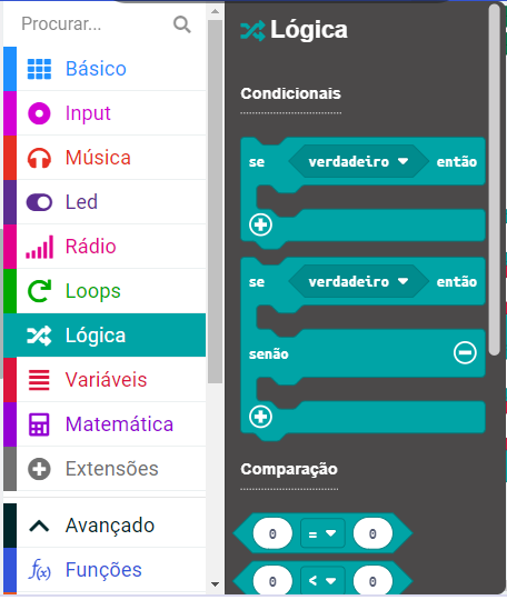 Para fazer isso com os blocos Makecode, acesse o menu: “Logica” selecione o bloco: “se então, se não”, conforme a imagem a seguir: