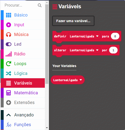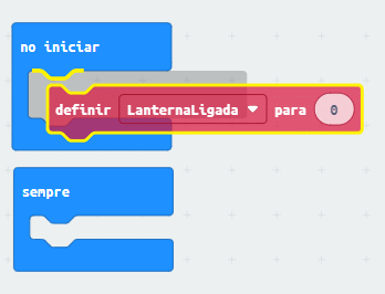 Em seguida, selecione o bloco: “definir LaternarLigada para” e arraste-o até que caiba no bloco: “at startup” conforme a imagem a seguir: