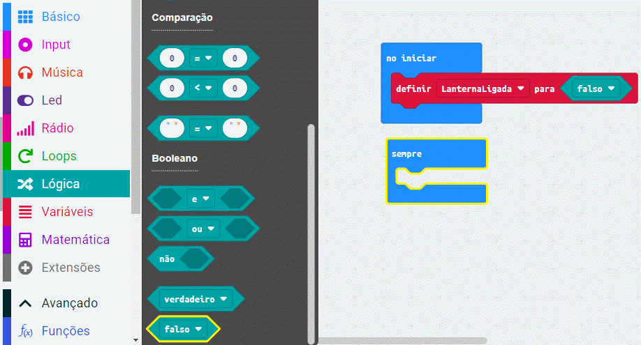 Agora, vá ao menu: “Logica” e selecione um bloco que retorne um valor booleano, arraste-o até o bloco: “definir LaternaLigada para”, conforme a imagem a seguir: