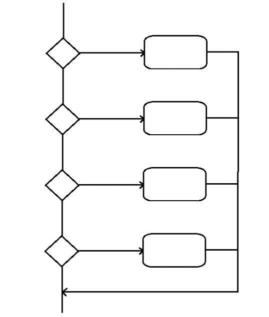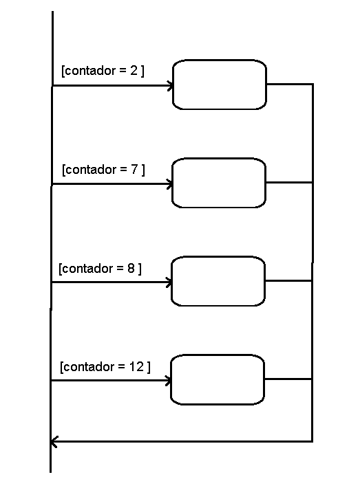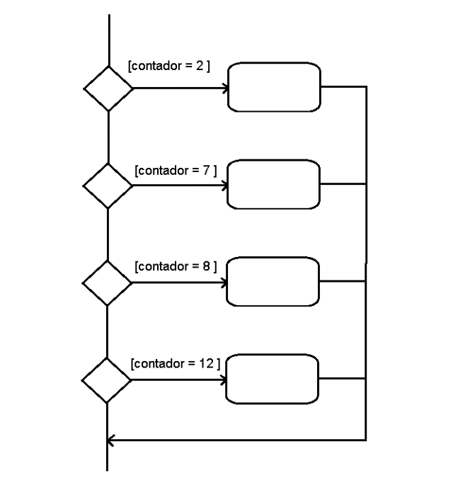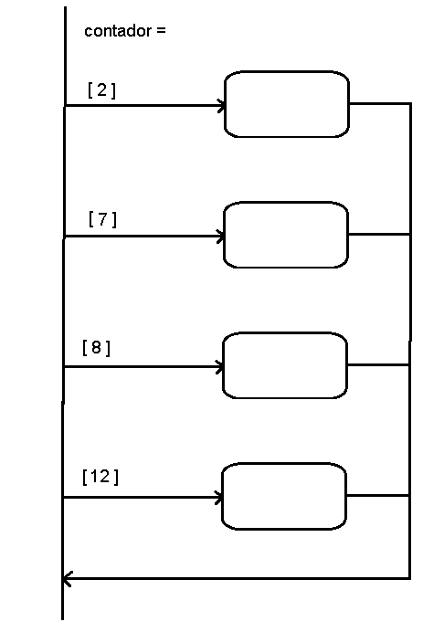 Como exemplo prático podemos pensar em uma variável do tipo inteiro chamada: "contador" a qual queremos realizar alguma atividade quando vale: 2, 7, 8 e 12. O diagrama pode ser semelhante ao mostrado na figura a seguir :
