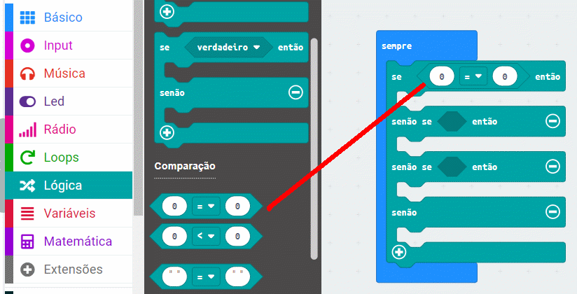 Agora vá para os blocos de comparação e arraste-os conforme mostrado na imagem a seguir:
