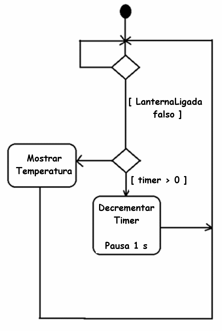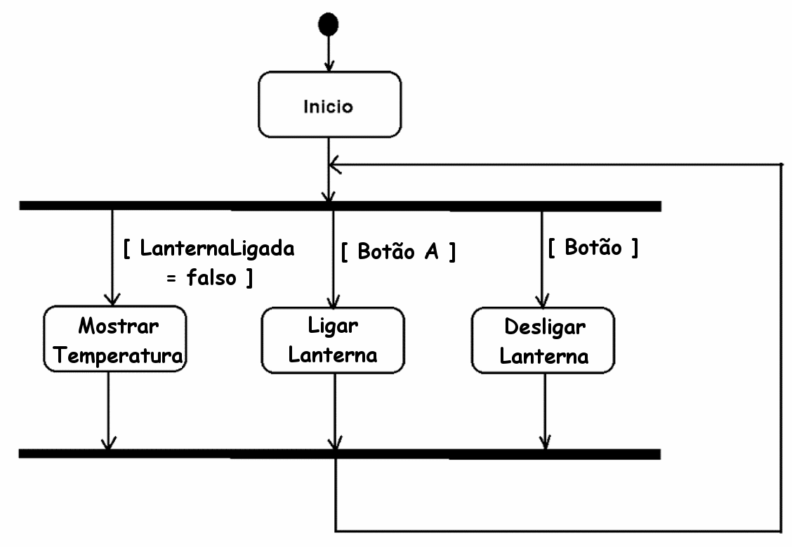 Como podemos ver, há uma atividade para o início. A seguir, entramos em um join onde existem 3 atividades que podem ser executadas em paralelo. Uma atividade para exibir a temperatura, outra atividade para ligar a lanterna e outra atividade para desligar a lanterna. Em seguida, entramos em outro entroncamento e a partir daí chegamos ao entroncamento superior e repetimos o loop. Podemos ver que as atividades são muito semelhantes aos casos de uso. Pode-se dizer que um diagrama de caso de uso pode ser entendido por qualquer pessoa. O diagrama de atividades é compreendido pelos programadores.
