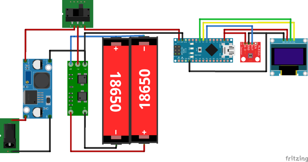Tomei o cuidado em lhe entregar um tutorial o mais próximo possível de um produto final para isso montamos o circuito de recarga das baterias de Íon-Lítio 18650, para que não precisa retirá-las do sistema, basta apenas conectar uma fonte de energia de 12v ou 9v (isso você vai definir e ajustar no regulador de tensão LM2596), o importante é que a tensão de saída dele seja ajustado para 8v que vai diretamente para a BMS 2S de 7,4v.