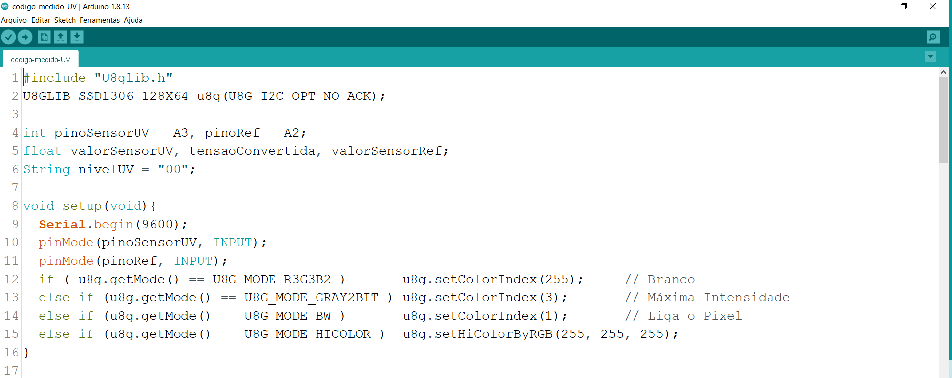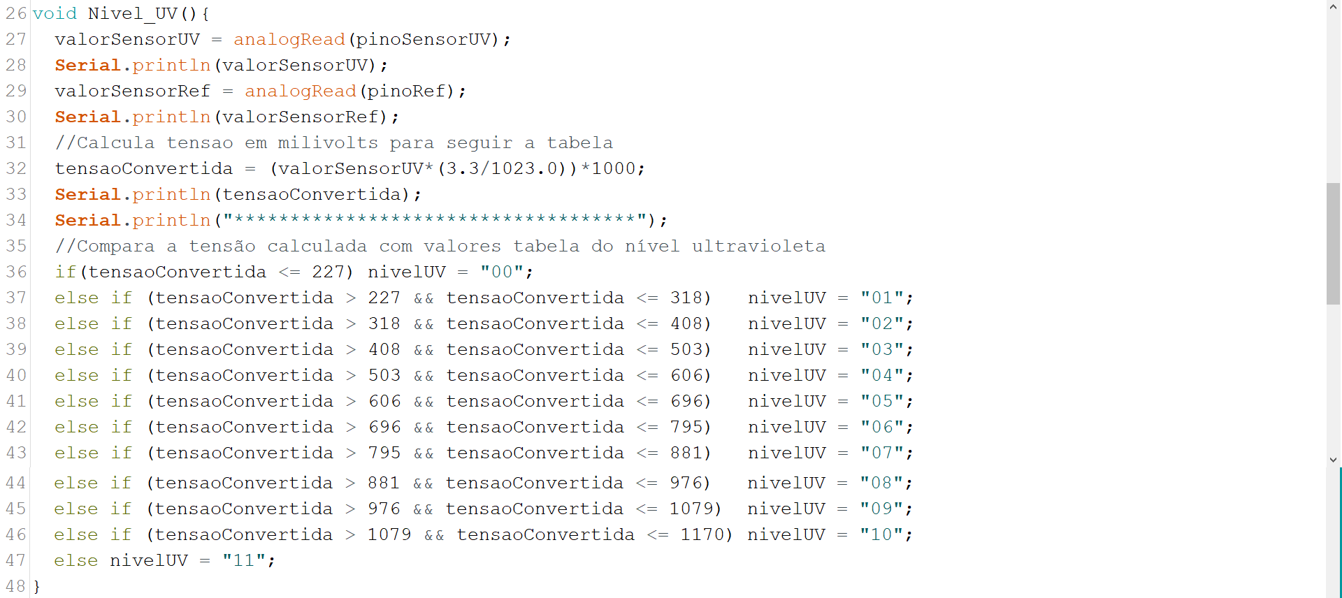 Na função Nivel_UV() é onde está a regar do negócio, o sensor UV varia o valor de sua saída em forma de tensão de acordo com a intensidade dos raios inseridos sobre ele, logo a linha 27 seria a responsável por fazer essa leitura, porém precisamos converter para uma faixa de valor que dependa da tensão de referência , como ligamos o nosso sensor na tensão 3,3v a formula aplicada é a descrita na linha 32, caso seja em 5v altere o 3.3 por 5 ou se você está usando o pino de referência, aquele que mostrei ligado na imagem com o Arduino Uno, substitua o valor 3.3 pela variável valorSensorRef, pois ela estará armazenando o que está sendo lido no pino A2 do Arduino conforme montagem.