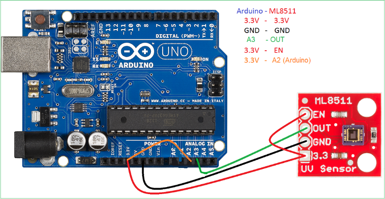 E como todo bom módulo, o sensor GYML8511 funciona com tensão contínua entre 3 a 5 V, o que é conveniente tanto para Arduino quanto outros microcontroladores, observe a montagem de nosso projeto na figura abaixo.