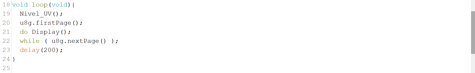 No void loop temos a chamada para as funções Nivel_UV() (iremos estuda-la logo abaixo), a função da biblioteca U8glib.h responsável por apresentar a imagem no display O’Led e se houver algo novo pra transmitir a linha 21 chama a função Display() que imprimi o resultado na tela do O’Led, aguardamos 200ms para que a comunicação i2C e impressão na tela ocorra tranquila.