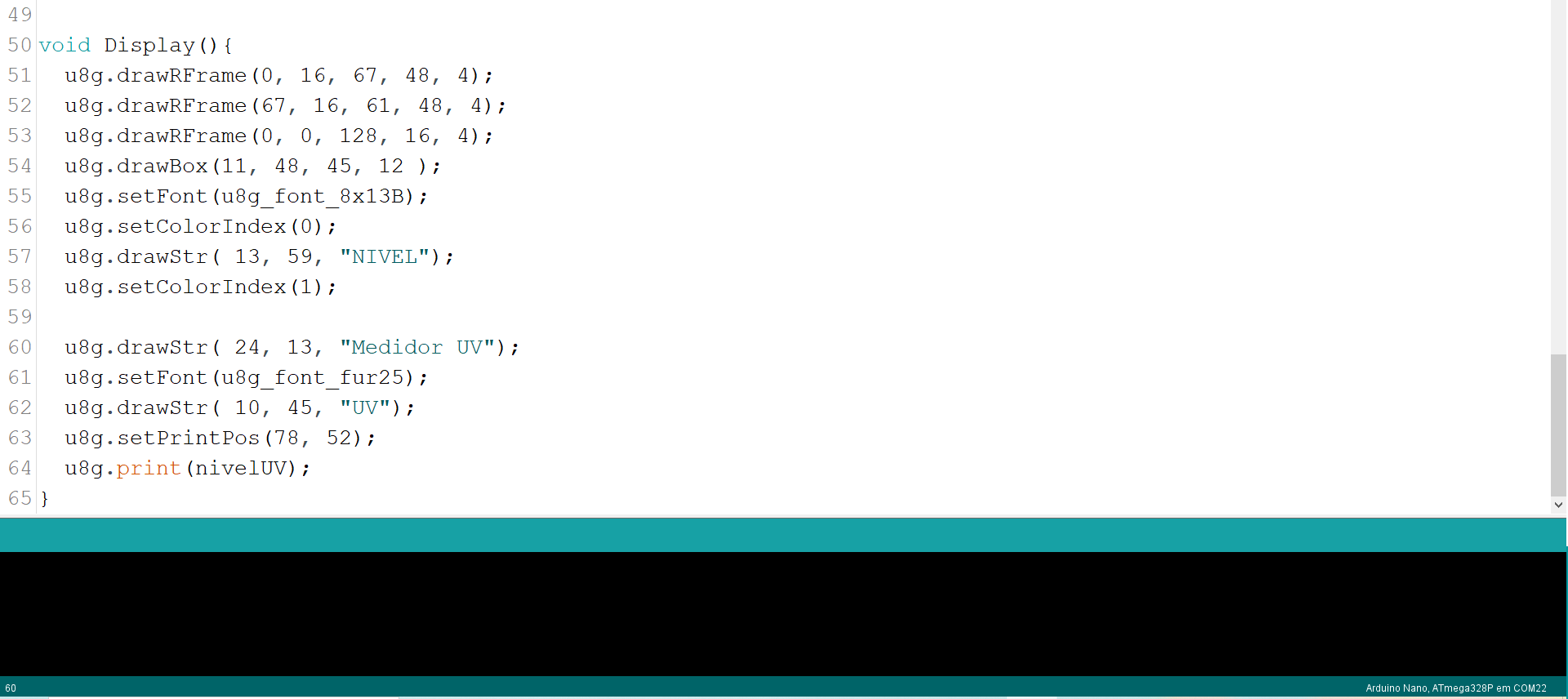 Já das linhas 36 a 47 está a lógica IF do que será apresentado no display, no meu caso optei por apresentar o valor do nível UV, mas você poderá alterar para informar qual protetor solar a mamãe deve passar no seu filho, ou seja, aqui é só pra abrir sua mente, agora vai depender do seu esforço de estudar e aplicar sua imaginação.