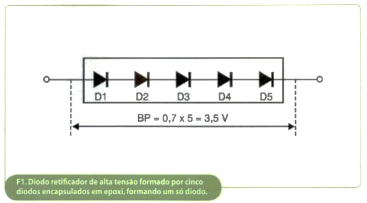 Por sua vez, a corrente direta máxima é definida como sendo: a corrente que circula através do diodo na polarização direta, ou seja, na condição em que o diodo apresenta uma baixa resistência. Os diodos de uso comum, normalmente suportam uma tensão máxima reversa de 800 V. Por outro lado, os diodos usados nos fornos trabalham com uma tensão reversa em torno de 4000 V. Para suportar essa alta tensão, são ligados cinco diodos comuns, em série, ambos com as mesmas características, como vemos na figura 1. Com isso, a tensão reversa total suportada pelos cinco diodos, é agora de: 5x800 = 4000 V.