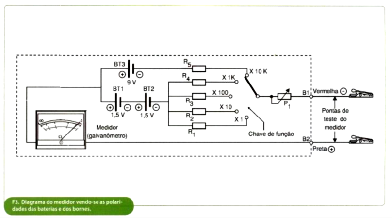 Na maioria dos medidores analógicos existentes no mercado, a escala de Ohms tem os seguintes fatores de multiplicação: x1; x10; x100; x1000 (1k) e x10000 (x10k), pelos quais, o valor lido sobre a escala do medidor deve ser multiplicado. Se formos analisar o esquema elétrico do Ohmímetro analógico, visto na figura 4, vamos observar que as quatro primeiras escalas são alimentadas por duas pilhas, BT1 e BT2, ligadas em série, fornecendo uma tensão total máxima de 3 V, ao passo que a escala x10k é alimentada por uma bateria, BT3 de 9 V.