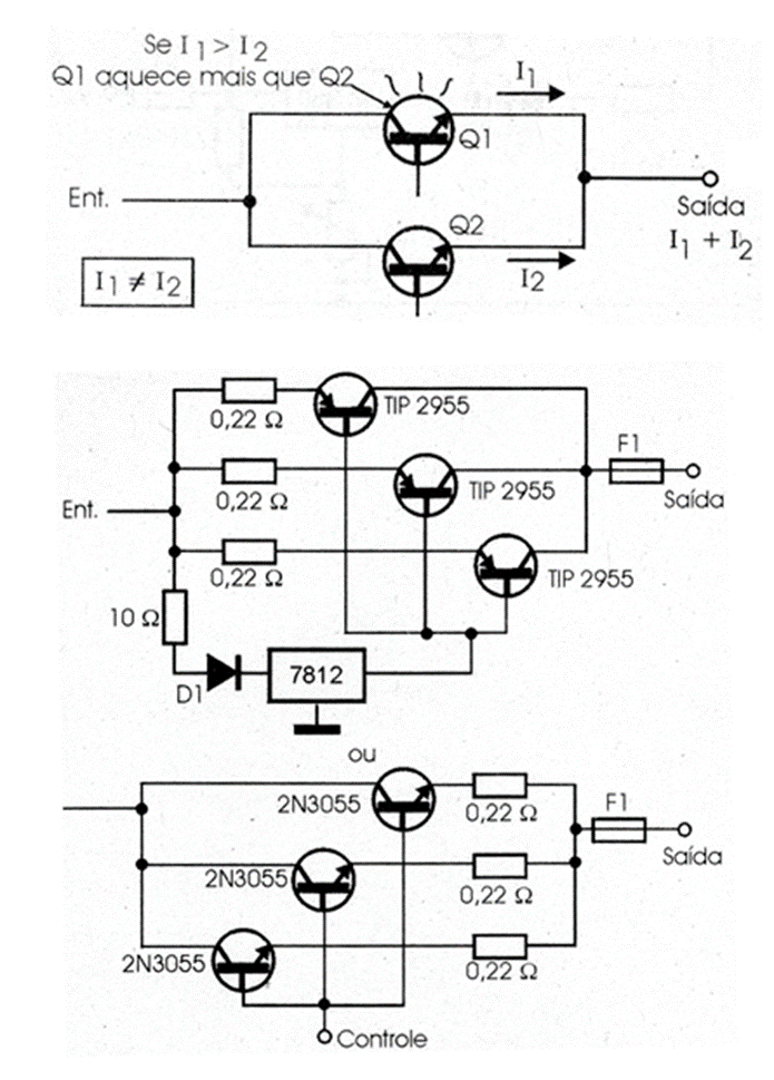 Se ligarmos dois 2N3055 para controlar uma corrente de 10 A numa fonte não podemos garantir que a corrente se divida exatamente por igual entre os dois. Os transistores têm pequenas diferenças de ganho, por exemplo.
