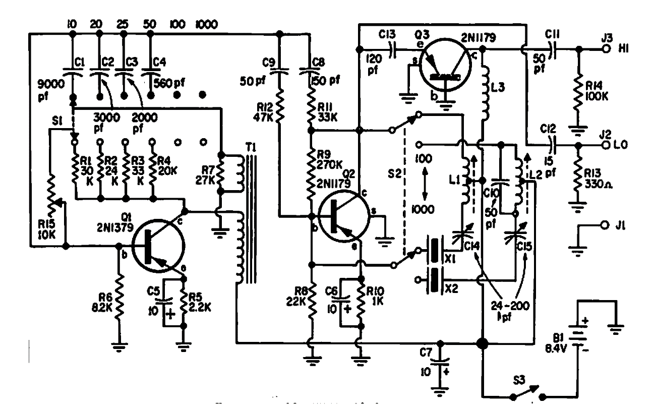 Este circuito para diversas frequências foi obtido em uma documentação americana dos anos 90. As frequências vão de 10 a 1 000 kHz em diversas faixas selecionadas por uma chave. Os cristais são de 100 kHz e 1 MHz.