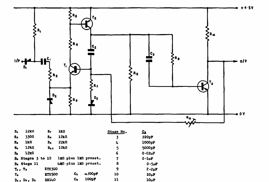 Encontramos este circuito em documentação da Ferranti de 1968. O circuito faz uso de transistores da época. Estes transistores podem ser substituídos por equivalentes modernos. O circuito divide a frequência de entrada por diversos valores.