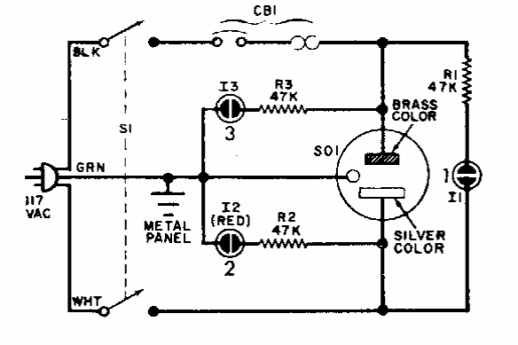 Este circuito testa o aterramento de uma tomada de três pinos. Encontramos numa Popular Electronics dos anos 80. As lâmpadas são do tipo Neon comum.